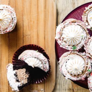 Festive. Decadent. Divine! These rich and creamy chocolate cupcakes with peppermint chocolate mousse centres and elegantly topped with mint marshmallow frosting are the perfect holiday treat!