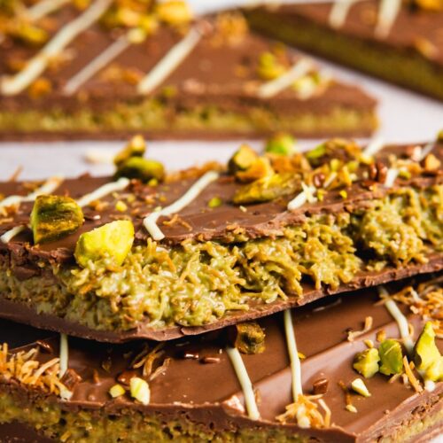 Remove chocolate bark from the fridge and spread your second layer of chocolate over the entire surface. Optional: Decorate with crushed pistachios, crunchy kataifi bits, and melted white chocolate. Allow to cool once more in the refrigerator, this time for at least 20 minutes.