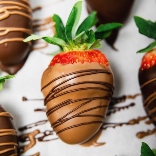 Optional: Take 2 tbsp of remaining chocolate and fill into piping bag. Cut off tip of piping bag and drizzle dipped chocolate covered strawberries with additional chocolate.